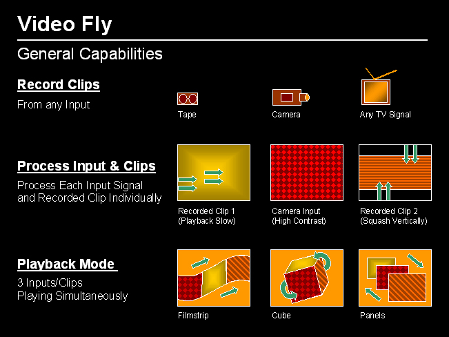 Video Performance Device Video Fly is a set of interactive video processing tools that allow the performer to manipulate live or recorded video “on the fly”. Using pre-recorded clips or a live camera image, the performer selects color and spatial effects to alter the video image in real time. The resulting image can be displayed via video projection or output to other standard video devices. Video camera inputs can remain stationary and focused on a single subject or can be moved. Using lightweight web cameras, the performer is able to smear the image into an abstraction by moving and swinging it wildly as a motion painting device. The developers, Terry Mohre and Pam Payne, enjoy the Video Fly device as an improvisational instrument to produce visual music and as a post processing tool. They perform with Video Fly in in the NYC area and elsewhere, often in collaboration with musicians, poets, dancers and performance artists.