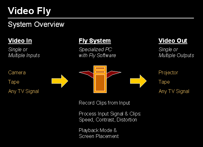 Video Fly is a PC-Based system with high-end gaming graphics cards and custom software. Video Fly Lite is a trimmed down laptop version. (click diagrams to enlarge) |